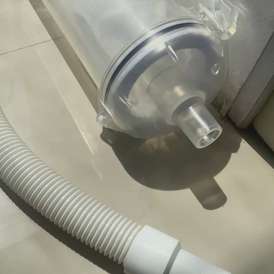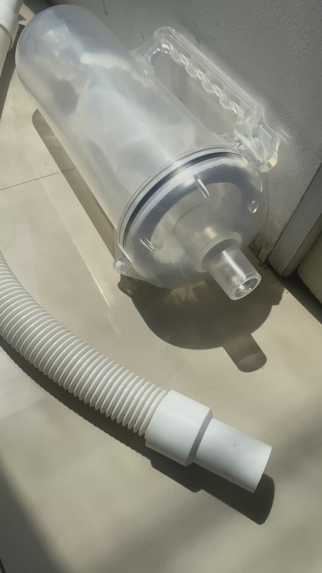 Descripción: Trampa de hojas transparente que se instala entre la barredora manual y la succión de la piscina para retener las impurezas de la piscina y evitar la saturación del sistema de filtración, cuenta con una bolsa de malla interna para retener los solidos