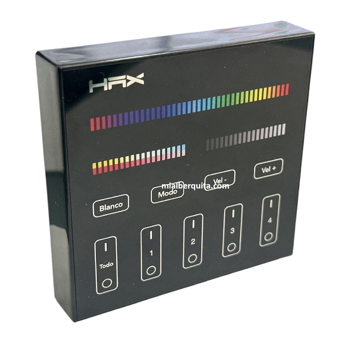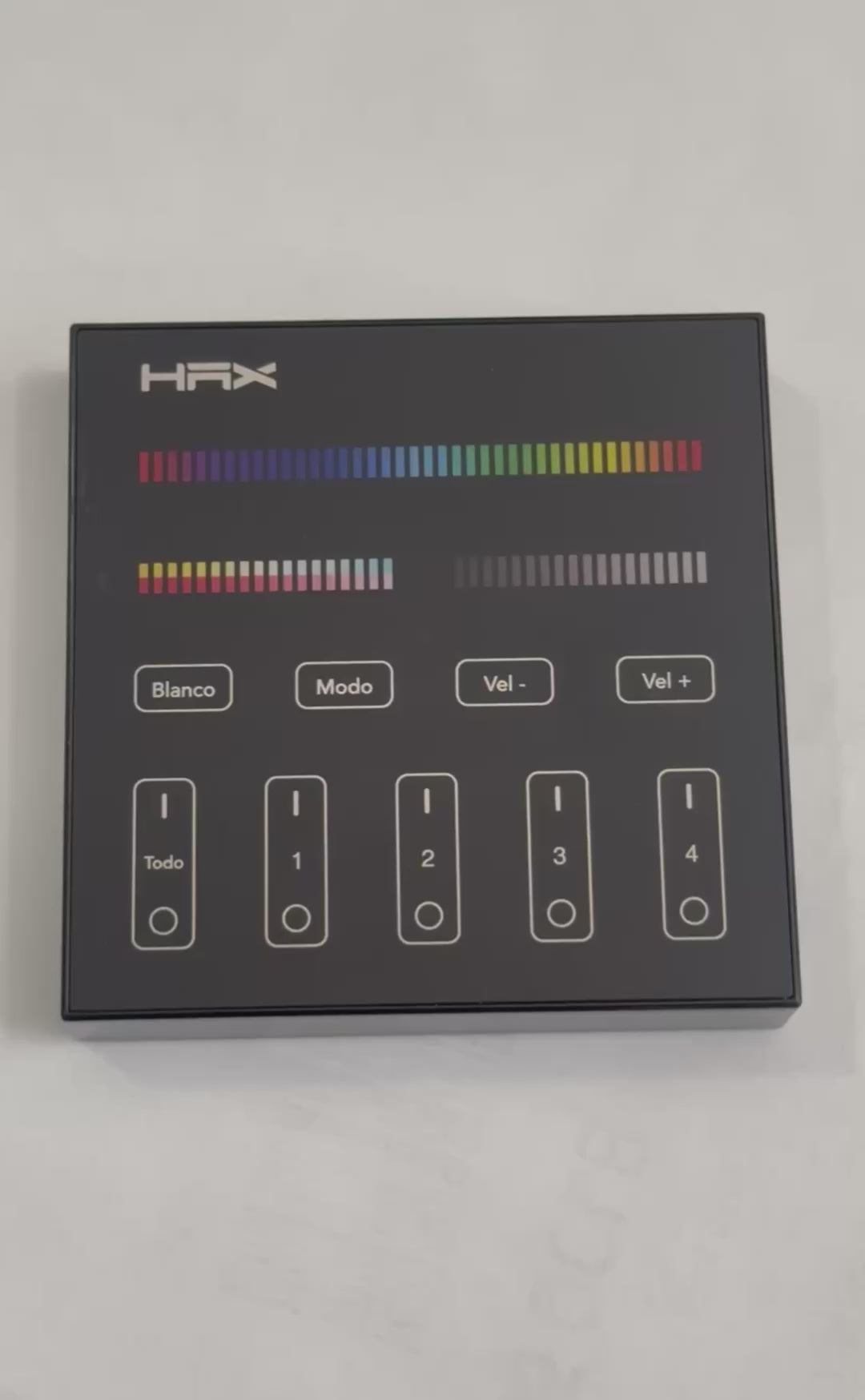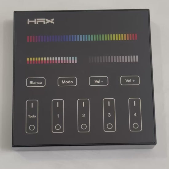 El panel de control remoto marca HAX maneja hasta 4 zonas independientes que pueden tener colores diferentes o sincronizarse en el mismo color y modo de iluminación. Su pantalla táctil de alta precisión permite seleccionar el color, la intensidad, la saturación y el modo de iluminación. La velocidad del cambio de color es ajustable.