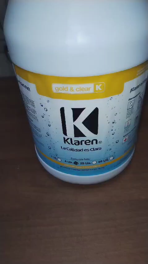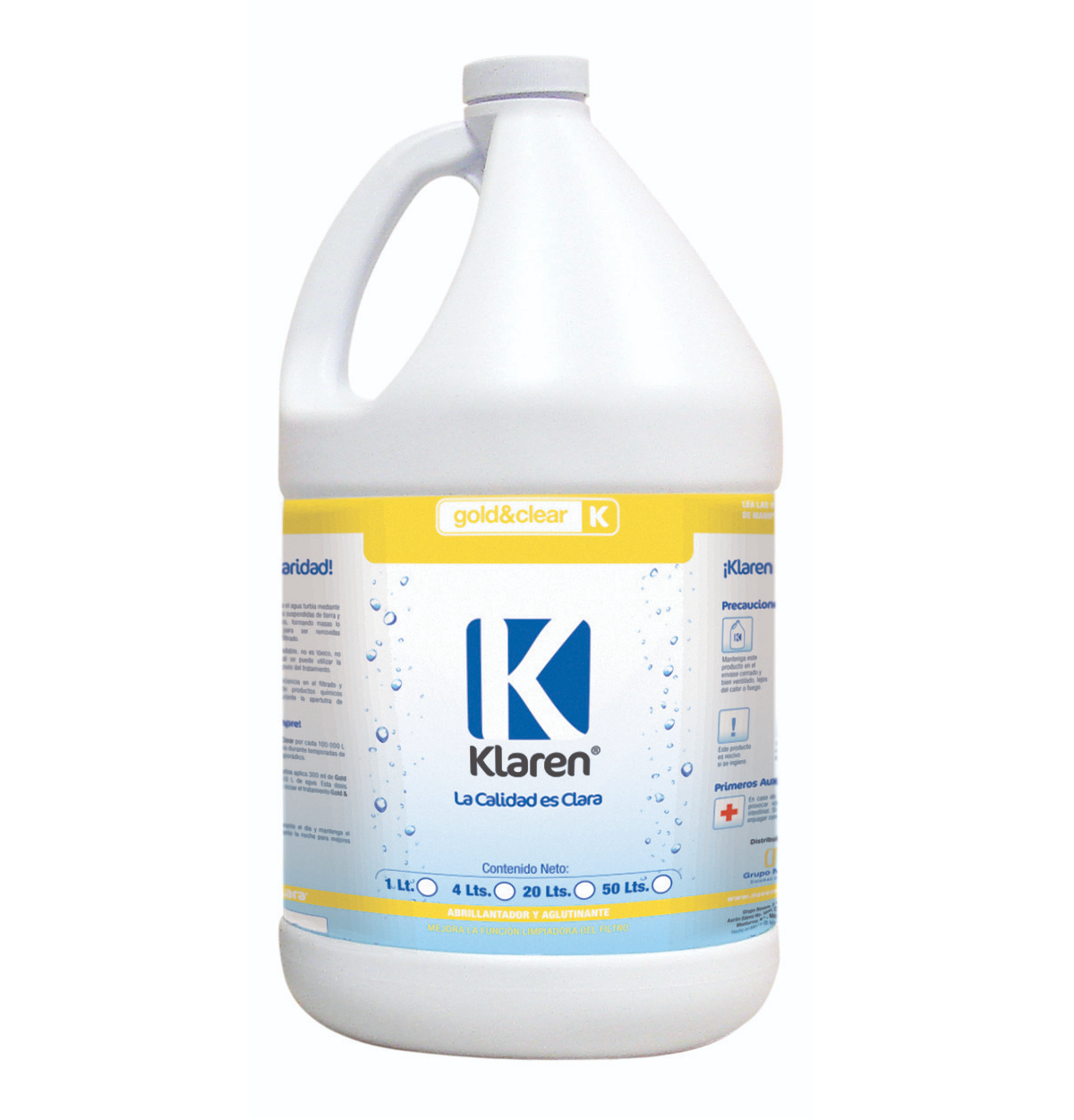 El Gold & Clear Klaren limpia y abrillanta el agua turbia provocado por las partículas microscópicas suspendidas, de polvo u otros compuestos insolubles, estas partículas por medio de una floculación incrementan su tamaño para que sean retenidos por el sistema de filtrado. Su fórmula especial a base de un polímero orgánico de carga positiva, incrementa en forma considerable la eficiencia del filtro, obteniendo excelentes resultados en cuanto abrillantes y cristalinidad.