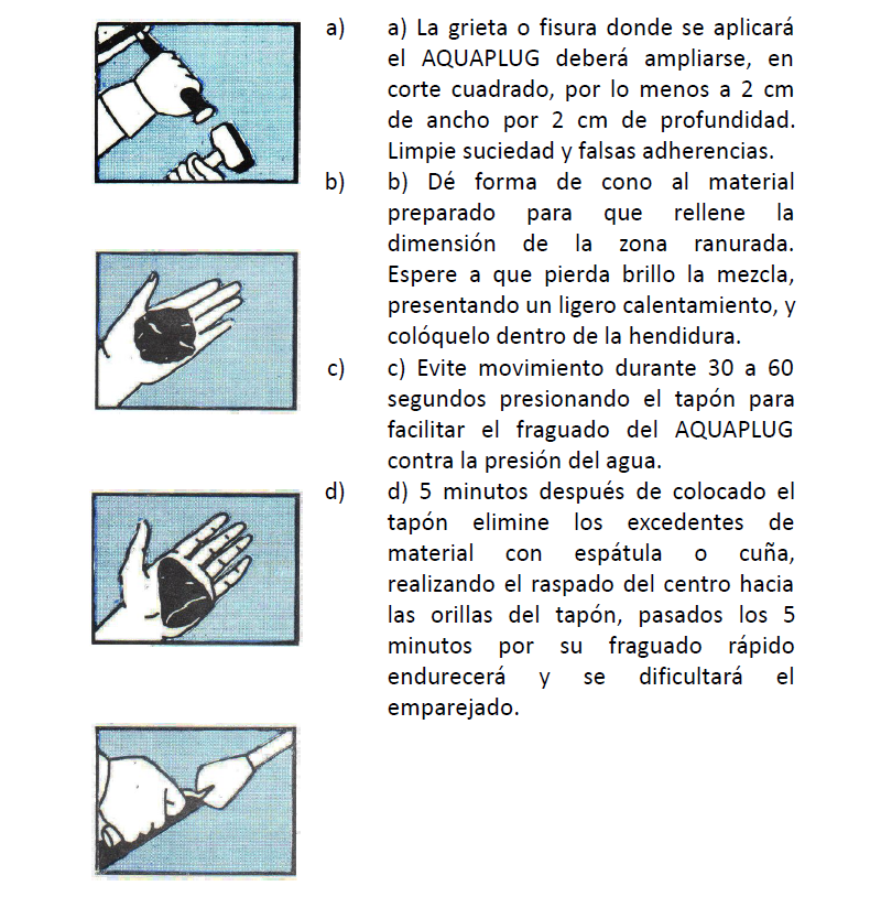3.- Presionar el tapón formado para facilitar el fraguado del AQUAPLUG contra la presión del agua al menos durante 30 a 60 segundos y evitar cualquier tipo de movimiento.